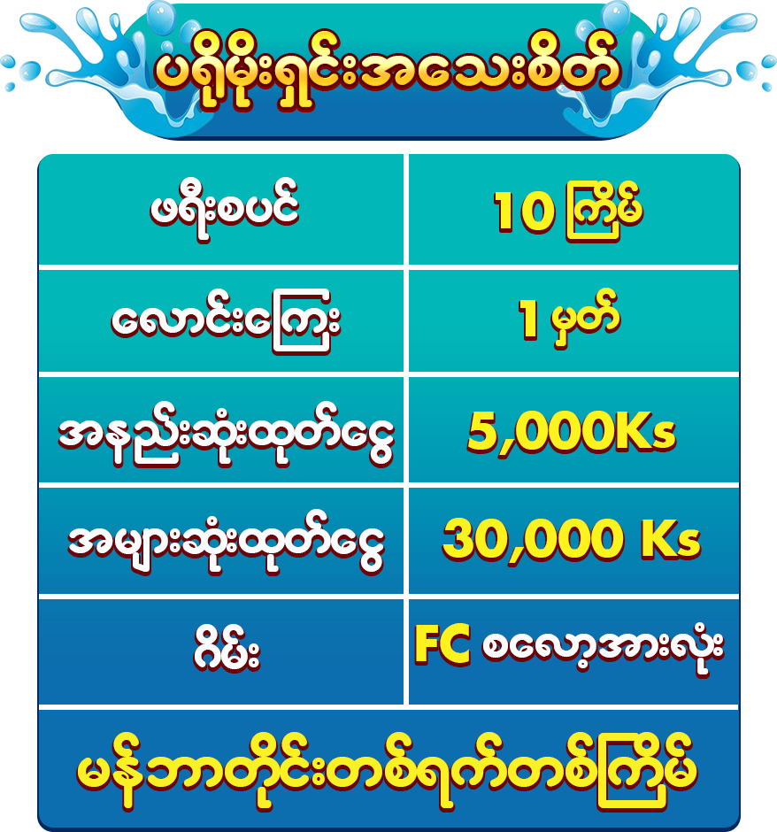 ✅ ပ႐ိုမိုးရွင္းအား 01/01/2026 မွစၿပီး တစ္ရက္လွ်င္( ျမန္မာစံေတာ္ခ်ိန္ (10:30 P.M To 10 :30 P.M ) ႐ိုး႐ိုးသြင္းေငြ 10,000 Ks သြင္းကစားထားေသာ မန္ဘာတိုင္း ေနာက္ေန႔ မွာ customer service သို ဆက္သြယ္ ရယူႏိုင္သည္