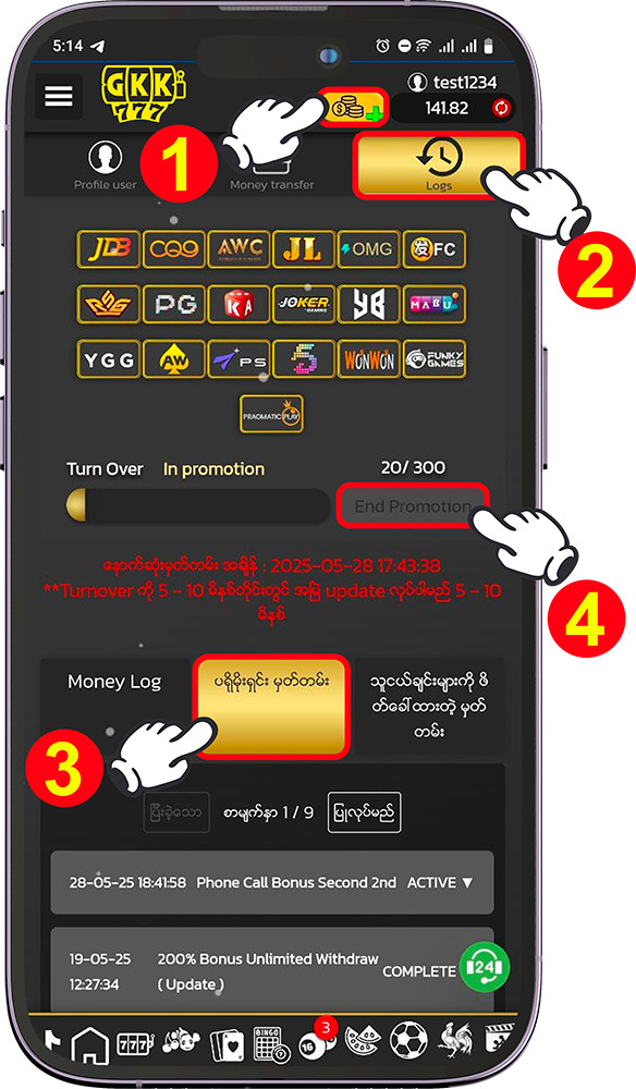 2. Slot ဂိမ္းအားလုံးတြက္ခ်က္ေပးပါသည္။(YGG ၊ ACE WIN မပါဝင္ပါ)အႏိုင္ရရွိေသာဆုမ်ားကို ႀကိမ္ေရတစ္ဆကစားၿပီးမွသာလွ်င္ေငြထုတ္ႏိုင္မည္။